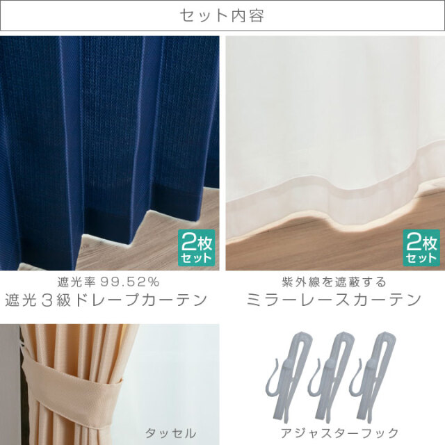 TOP日用品 カーテン 4枚セット ミラーレース 幅100cm 丈135cm 178cm 200cm 遮光カーテン 遮光3級 UVカット 遮熱 遮光 ミラー 遮像 カーテン レース セット 形状記憶加工 ウォッシャブル 洗える 21S005 価格: ¥3,280 (税込) 販売期間: カラー: 選択してください 【2~5営業日以内に発送予定】ピンク 【2~5営業日以内に発送予定】ベージュ 【2~5営業日以内に発送予定】ブラウン 【2~5営業日以内に発送予定】ネイビー 【2~5営業日以内に発送予定】グレー 【2~5営業日以内に発送予定】グリーン サイズ: 選択してください 100cm×135cm 100cm×178cm 100cm×200cm 数量: 個 カラーサイズ在庫【2~5営業日以内に発送予定】ピンク100cm×135cm○100cm×178cm○100cm×200cm○【2~5営業日以内に発送予定】ベージュ100cm×135cm○100cm×178cm×100cm×200cm×【2~5営業日以内に発送予定】ブラウン100cm×135cm○100cm×178cm○100cm×200cm○【2~5営業日以内に発送予定】ネイビー100cm×135cm×100cm×178cm×100cm×200cm○【2~5営業日以内に発送予定】グレー100cm×135cm×100cm×178cm×100cm×200cm×【2~5営業日以内に発送予定】グリーン100cm×135cm×100cm×178cm×100cm×200cm○ 返品についての詳細はこちら ※ご使用のモニター、デバイス環境により、色の見え方が異なる場合がございます。※また、生産ロットにより同品番でも色味が異なる場合がございますので、ご了承ください。 商品サイズ・組成について (カーテン) アイテム 寸法 組成 カーテン 約100×135cm約100×178cm約100×200cm 外:ポリ100%ジャガード生地 約145g/m2 裏:ポリ100%レース生地 約98g/m2 製造国 :中国