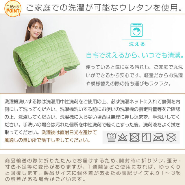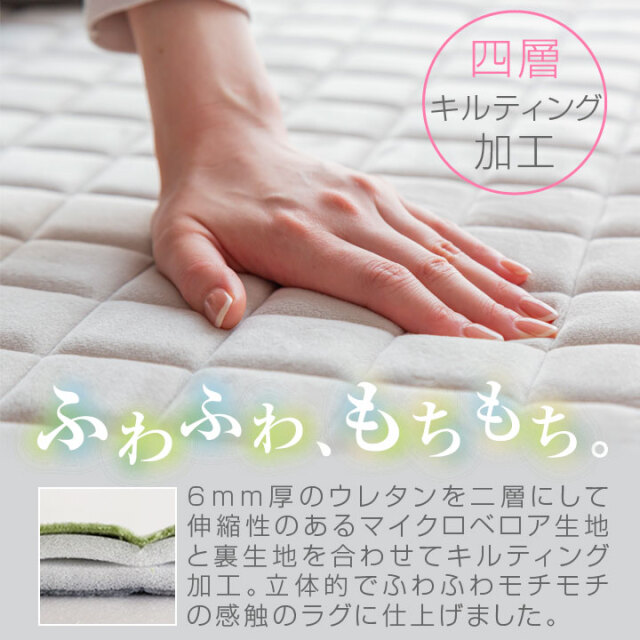 TOPラグマット もちもちキルトラグ ラグ もちもち キルト 190×190 洗える ラグマット ウレタン 2層構造 マット ラグカーペット 夏 冬 カーペット 床暖房対応 ホットカーペット対応 北欧 ウォッシャブル 絨毯 こたつ敷き 正方形 2畳用 22A009 価格: ¥4,780 (税込) 販売期間: カラー: 選択してください 【1~3営業日以内に発送予定】グリーン 【1~3営業日以内に発送予定】グレー 【1~3営業日以内に発送予定】ピンク 【1~3営業日以内に発送予定】アイボリー 【1~3営業日以内に発送予定】ブラウン 【1~3営業日以内に発送予定】ベージュ 数量: 個 カラー在庫【1~3営業日以内に発送予定】グリーン○【1~3営業日以内に発送予定】グレー○【1~3営業日以内に発送予定】ピンク○【1~3営業日以内に発送予定】アイボリー○【1~3営業日以内に発送予定】ブラウン○【1~3営業日以内に発送予定】ベージュ× 返品についての詳細はこちら ※ご使用のモニター、デバイス環境により、色の見え方が異なる場合がございます。※また、生産ロットにより同品番でも色味が異なる場合がございますので、ご了承ください。 商品サイズ・組成について (ラグ) アイテム 寸法 組成 ラグ 約190×190cm 表生地:ポリエステル95% ポリウレタン5% 裏生地:ポリエステル100% 詰め物:ウレタンフォーム 製造国 :中国