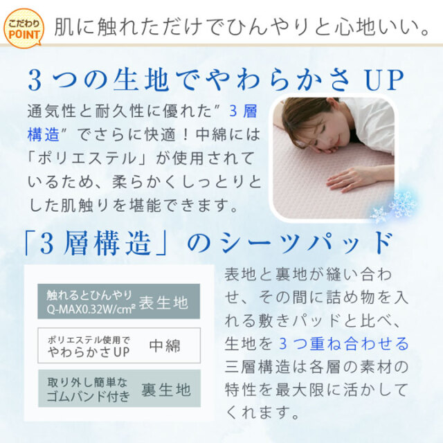 TOP敷きパッド 敷きパッド シーツパッド 冷感 接触冷感 ひんやり 3層構造 薄手タイプ 軽量 速乾 やわらかい ダブル 140×200cm 脱着簡単ゴム付き 敷パット ベッドパッド 布団 ベッド 23J027 価格: ¥1,980 (税込) 販売期間: カラー: 選択してください 【2~5営業日以内に発送予定】ブルー 【2~5営業日以内に発送予定】グレー 【2~5営業日以内に発送予定】ピンク 数量: 個 カラー在庫【2~5営業日以内に発送予定】ブルー○【2~5営業日以内に発送予定】グレー○【2~5営業日以内に発送予定】ピンク○ 返品についての詳細はこちら ※ご使用のモニター、デバイス環境により、色の見え方が異なる場合がございます。※また、生産ロットにより同品番でも色味が異なる場合がございますので、ご了承ください。 商品サイズ・組成について (冷感三層シーツパッド ダブルサイズ) アイテム 寸法 組成 冷感三層シーツパッド 約140×200cm 表地:ナイロン100% 中綿・裏地:ポリエステル100%% 製造国 :中国