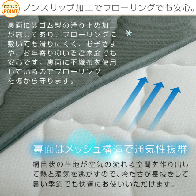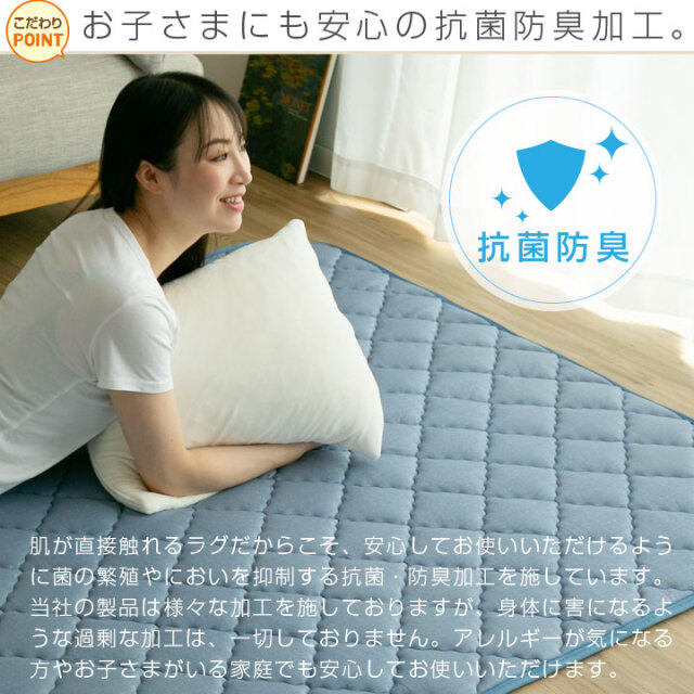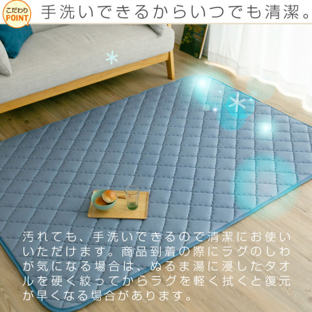TOPラグマット ラグ 冷感ラグ ひんやり 接触冷感 ラグマット 夏用 190×240 滑り止め付 マット 洗える ラグカーペット 夏 カーペット 防音 抗菌防臭 ウォッシャブル メッシュ 絨毯 24S040 価格: ¥5,980 (税込) 販売期間: カラー: 選択してください 【2~5営業日以内に発送予定】グレー 【2~5営業日以内に発送予定】ネイビー 【2~5営業日以内に発送予定】ブラウン 数量: 個 カラー在庫【2~5営業日以内に発送予定】グレー×【2~5営業日以内に発送予定】ネイビー×【2~5営業日以内に発送予定】ブラウン× 返品についての詳細はこちら ※ご使用のモニター、デバイス環境により、色の見え方が異なる場合がございます。※また、生産ロットにより同品番でも色味が異なる場合がございますので、ご了承ください。 商品サイズ・組成について (冷感ラグ) アイテム 寸法 組成 冷感ラグ 約190×240cm 表地:ポリエステル80%+ナイロン20% 140g/m2 抗菌防臭加工 不織布:15g/m2普通不織布 中綿:120g/m2 ウレタン:25D 10mm 裏地:サンドイッチメッシュ すべり止め加工 130g/m2 製造国 :中国