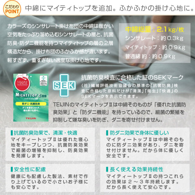 | 掛布団 | 約150×210cm | 側生地:ポリエステル 100% 中綿:ポリエステル 100% 2.1kg/枚 マイテイ50% シンサレート 100g/m2 |